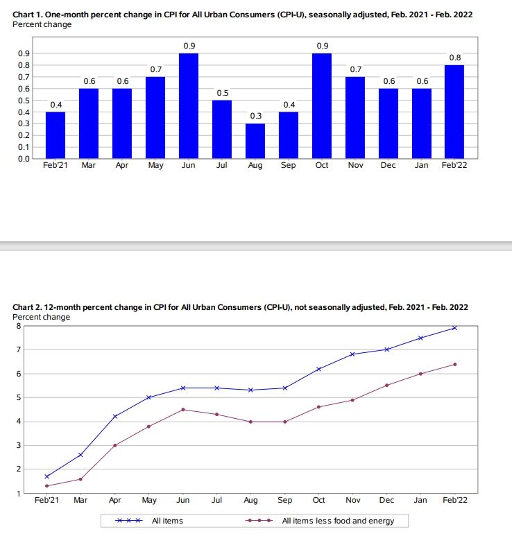 미국 노동부가 지난달 발표한 2월 CPI 상승률은 전년 대비 7.9%로 1982년 1월 이후 약 40년 만에 가장 높았다. 미국 증시는 CPI 발표를 앞두고 물가 상승 우려에 급락했다. 11일 미 다우존스30 산업평균 지수는 1.19% 내렸고 스탠더드앤드푸어스(S&P)500 지수도 1.69% 떨어졌다. 특히 나스닥은 2.18% 급락했다.