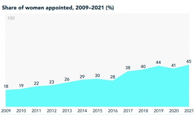 이미지 확대보기하이드릭앤스트러글스의 보고서에 따르면 글로벌 500대 기업의 이사회 신규 멤버 449명 중에서 여성이 차지하는 비중은 지난 2020년 41%에서 지난해 45%로 증가해 사상 최고를 기록했다.