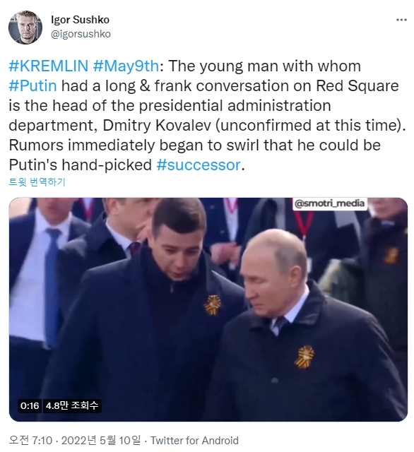 특히 뉴스위크에 따르면 푸틴 대통령이 지난 9일 모스크바에서 열린 2차대전 승전 기념일 행사에 참석한 자리에 동반시킨 최측근 때문에 푸틴이 정치적 승계자를 이미 낙점해놓은 것이 아니냐는 관측이 소설미디어를 중심으로 빠른 속도로 퍼지고 있다.