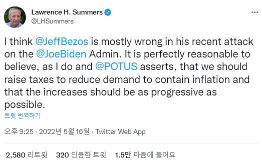 빌 클린턴 행정부에서 재무부 장관을 역임하고 하버드대 총장을 지냈으며 현재 하버드대에서 경제학을 가르치고 있는 래리 서머스는 이날 올린 트윗에서 “베조스가 바이든 대통령을 비판한 내용은 대체로 잘못된 것으로 보인다”고 주장했다.