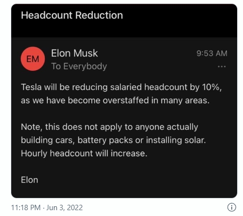 일론 머스크 테슬라 CEO가 지난 3일(현지시간) 사내 통신문에서 밝힌 10% 인력 감축 계획. 사진=로이터