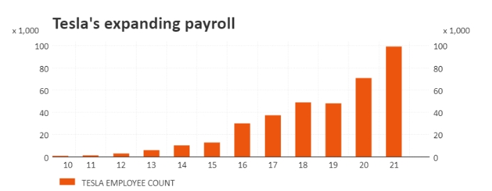 로이터는 테슬라가 미 증권거래위원회(SEC)에 보고한 자료를 근거로 “지난해말 기준으로 테슬라와 계열사에서 일하는 임직원은 10만명에 육박한다”고 보도했다.