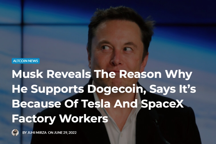 29일(이하 현지시간) 가상화폐 전문매체 이더리움월드뉴스(EWN)에 따르면 머스크 CEO는 지난 21일 블룸버그통신이 마련한 ‘카타르 경제포럼’에 참여한 자리에서 블룸버그와 진행한 인터뷰에서 비판 여론이 있음에도 도지코인에 대한지지 입장을 고수하고 있는 배경에 대해 질문을 받고 “테슬라와 스페이스X 직원들이 도지코인에 대한 지지를 내가 보내줄 것을 그동안 내게 요청했고 그에 내가 화답한 것”이라고 밝혔다.