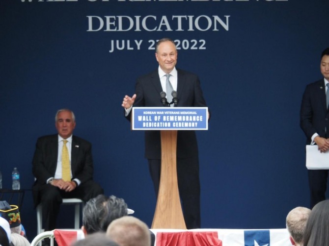 '세컨드 젠틀맨'인 엠호프는 조 바이든 대통령을 대신해 참석했다고 말했다. 바이든 대통령은 당초 이 헌정식에 직접 참석하는 방안을 검토했으나 신종 코로나 바이러스 감염증 (코로나19) 확진 등으로 인해 참석하지 못했다. 엠호프는 “우리가 계속 한국과 나란히 서 있을 것이고, 추모의 벽은 이 약속을 구체적이고 영원히 상기시키는 것”이라고 말했다. 그는 지난 5월 윤 대통령의 취임식 때 미국 측 축하 사절단을 이끌고 한국을 방문했었다.