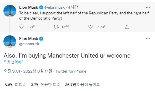 이미지 확대보기로이터통신 등 외신에 따르면 머스크가 이날 올린 트위에서 맨유와 밝힌 내용은 “맨유를 인수할 계획”이라는 것.