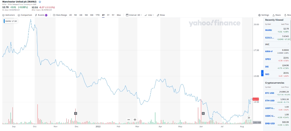 뉴욕증시에 상장된 맨유의 시가총액은 현재 20억8000만달러(약 2조7000억원) 정도로 추산되고 있다.