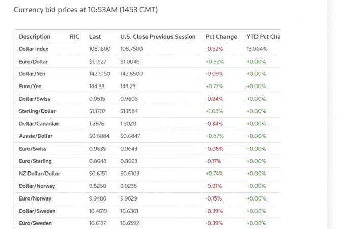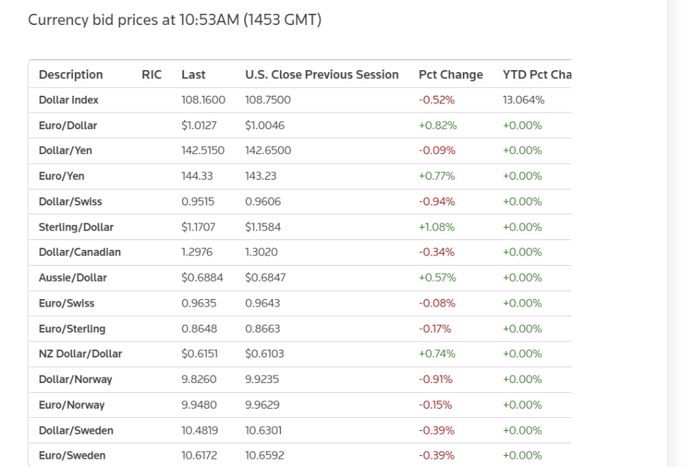 NEW YORK, Sept 12 (Reuters) - The U.S. dollar fell to its lowest level in about two weeks against a basket of currencies on Monday following recent strong gains, as investors grew nervous ahead of U.S. inflation data and as central banks outside of the United States appeared increasingly hawkish. The euro climbed to more than a three-week high against the dollar, with European Central Bank officials arguing for further aggressive monetary tightening. Strategists said the release on Tuesday of the monthly U.S. consumer price index report will be closely watched for clues on how aggressive the Federal Reserve may need to be in hiking interest rates next week to fight high inflation. After hawkish comments from Fed Chair Jerome Powell and other U.S. central bank officials last week, U.S. rate futures were pricing in a high chance of a 75-basis-point hike at the Sept. 20-21 policy meeting. The dollar index , which measures the currency against six major counterparts, was 0.5% lower on the day at 108.16, and it hit its lowest level since Aug. 26. It reached a two-decade peak of 110.79 last Wednesday.