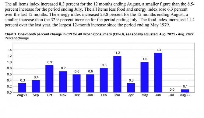 미국 노동부는 13일 밤 8월 CPI를 공식 발표했다. 노동부가 발표한 이달 미국의 소비자 물가지수 상승률은 8,.3%이다. 이는 6월의 9.1%와 7월의 8.5%에 비해 크게 낮아진 것이다. 미국 물가의 피크 아웃이 본격화되고 있는 것이다. 미국 소비자물가의 정점 통과는 뉴욕증시 비트코인에 큰 호재이다. 미국 뉴욕증시에서는 연준 FOMC 자이언트스텝 금리인상 속도조절에 나설 것이라는 기대가 나오고 있다. 미국 CPI는 연준이 9월 공개시장위원회(FOMC) 회의에서 얼마나 금리를 인상할지를 예상할 수 있게 해 준다는 점에서 전 세계의 주목을 받아왔다. 전월 대비 물가는 0.1% 올랐다.