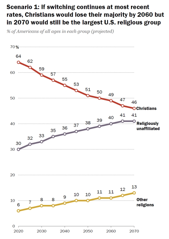 퓨리서치는 개신교 신자 비율이 앞으로 계속 내려가는 추세가 이어질 경우 2020년 64%였던 개신교 신자 비율은 2070년에는46%로 떨어질 것으로 예상된다고 밝혔다.