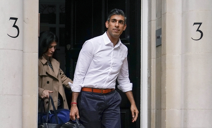 리시 수낵 영국 전 재무장관이 23일(현지시간) 런던에 있는 그의 선거사무소를 나서고 있다. [사진=뉴시스]