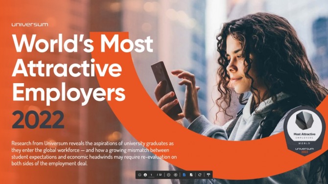 기업 브랜딩 전문 조사업체 유니버섬이 경영학 전공자 8만여명, 엔지니어링 관련 전공자 약 7만명, IT 관련 전공자 2만여명 등 전세계 경제강국 9개국의 대학 졸업자 18만여명을 대상으로 지난해 9월부터 지난 5월까지 설문조사한 결과를 토대로 최근 펴낸 ‘2022년 가장 매력적인 고용주 현황’ 보고서의 내용이다.