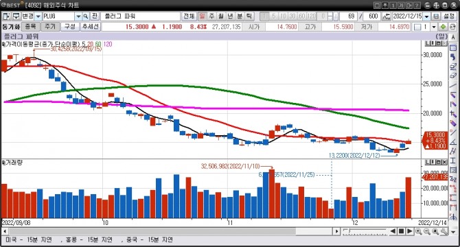 이날 플러그파워는 1.10달러(7.80%) 급등한 15.21달러로 뛰어올랐다.