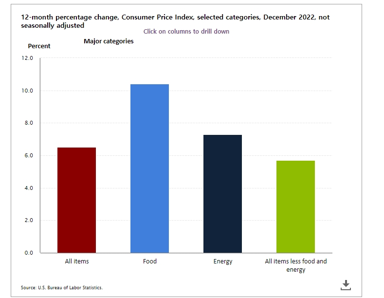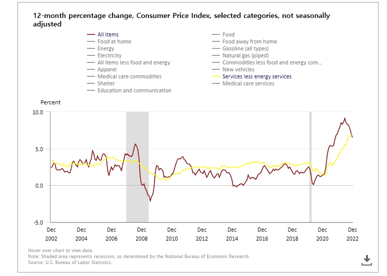 이 같은 노동부 소비자물가지수 발표에 미국 뉴욕증시와 달러환율 국채금리 국제유가 그리고 비트코인 이더리움 리플 등 가상 암호화폐는 환호하고 있다. 당초 CPI 컨센서스는 6.5% 올라 전달의 7.1% 상승에서 크게 둔화했을 것으로 예상됐다. 전월 대비로도 0.1% 하락해 전달의 0.1% 상승에서 하락세로 돌아설 것으로 전망됐다. 헤드라인 물가는 지난 6월에 40년 만에 최고치인 9.1%까지 올랐었다. 변동성이 심한 에너지와 식료품 가격을 제외한 12월 근원 CPI도 전년 대비 5.7% 올라 전달의 6.0% 상승에서 둔화할 것으로 사전에 예상됐다.