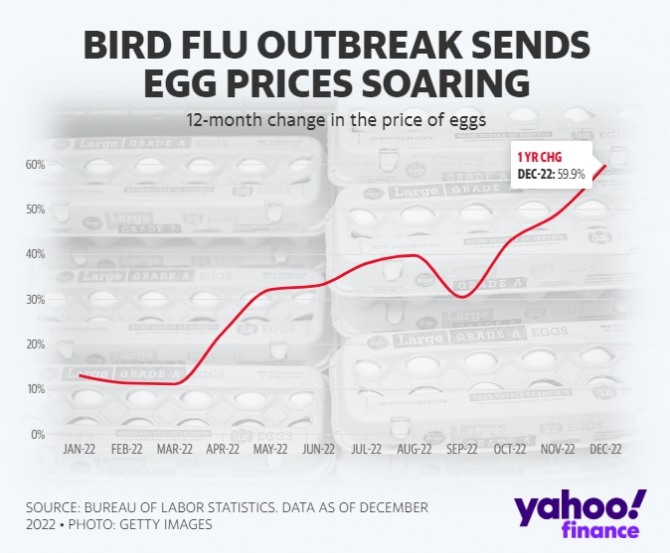 웰스파고은행의 케빈 베르크퀴스트 애널리스트는 야후뉴스와의 인터뷰에서 “조류독감의 확산으로 미국 전체 양계용 닭의 약 10%가 살처분되면서 계란 생산량이 약 5%나 감소해 가격이 급등했다”고 설명했다.