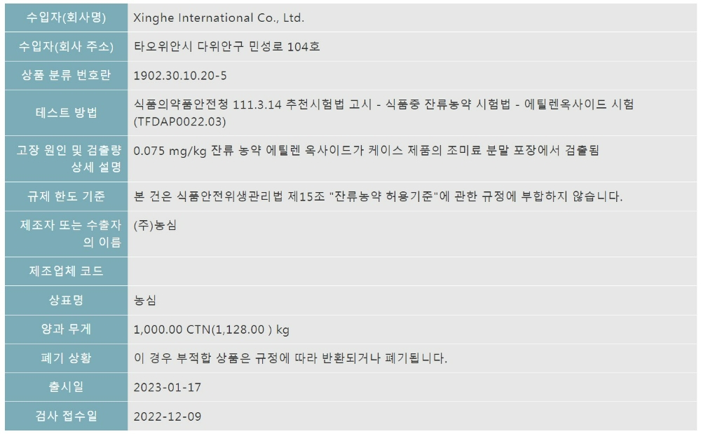 이미지 확대보기지난 2022년 12월 9일 샘플 검사 결과 조미료에서 1급 발암물질인 에틸렌옥사이드 0.075㎎/㎏이 검출돼 '식품안전위생관리법 제15조 잔류농약 허용기준에 관한 규정'을 위반했다고 대만 식약청이 고시했다.