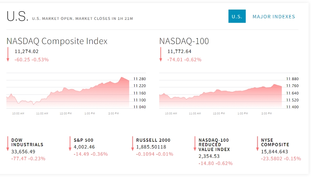 이미지 확대보기26일 뉴욕증권거래소(NYSE)에 따르면 다우존스30산업평균지수와 스탠더드앤드푸어스(S&P)500지수 그리고 나스닥지수 모두 떨어지고 있다. 장 막판에 다가가면서 그 낙폭은 줄고 있다. 비트코인 이더리움 리플 등 가상 암호화폐도 줄줄이 흔들리고 있다.