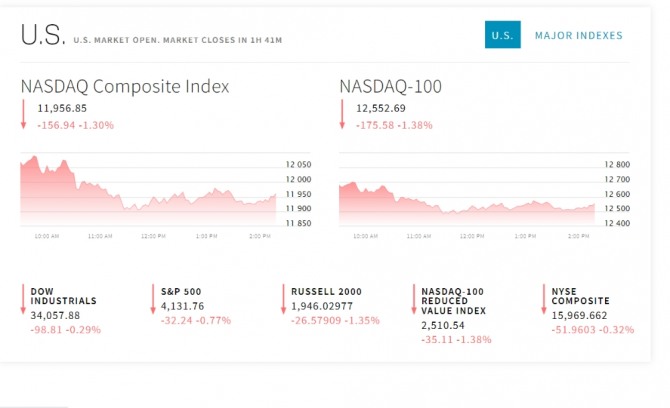 8일(미 동부시간) 뉴욕증권거래소(NYSE)에서 오전 10시12분 현재 다우존스30산업평균지수는 전장보다 68.01포인트(0.20%) 하락한 34,088.68을 기록 중이다.