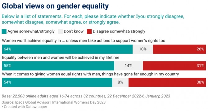 나라별로 나온 응답을 분석한 결과 평균적으로 68%가 남녀간 불평등이 존재하며 남녀 모두가 이를 개선하는데 함께 노력해야 한다고 생각하는 것으로 나타났다. 지난 2017년 조사했을 때 나타난 결과와 비교하면 이같이 답한 응답자는 5퍼센트포인트 감소했다. 양성평등이 그 사이 크게 개선되지 않았음을 시사하는 대목이다.