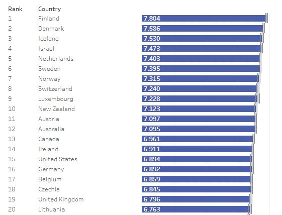 올해 순위에서 새로운 점은 리투아니아가 처음으로 20위권에 진입했다는 점이다. 리투아니아는 에스토니아, 라트비아와 함께 발트 3국을 구성하는 나라.