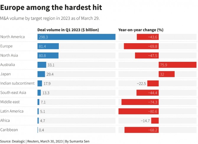 지역별로 살펴보면 스위스의 세계적인 투자은행 크레디트스위스이 유동성 위기를 맞으면서 금융시장 불안이 고조된 유로존과 실리콘밸리은행의 파산으로 역시 심각한 금융위기를 겪고 있는 미국에서 M&A 감소가 두드러진 것으로 나타났다.