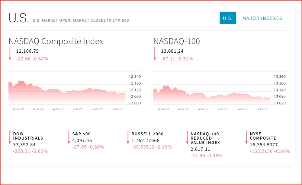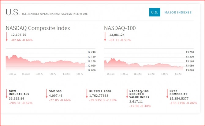 5일 뉴욕증시는 약세 기조이다. 뉴욕증권거래소(NYSE)에서 다우존스30산업평균지수와 스탠더드앤드푸어스(S&P)500지수 그리고 나스닥지수 모두 부진하다, 전장보다 12.07포인트(0.1%) 떨어진 12,177.38을 나타냈다. 이날 뉴욕증시는 상승 출발 후 반락했다. 미국의 경제 지표가 예상보다 부진한 수준으로 나오면서 뉴욕증시 주가를 끌어내린 것으로 해석된다.