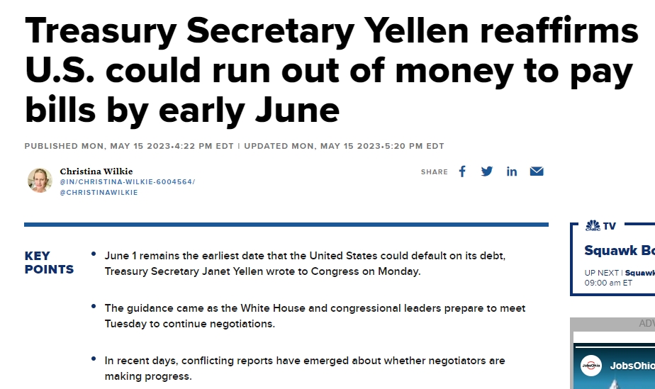 그는 부채 한도 협상 타결 지연으로 미국이 이미 대가를 치르고 있다고 주장했다. 6월 초 만기가 도래하는 국채에 대한 차입 비용이 급격히 증가했다는 것이다. 옐런 장관의 반복된 경고는 부채한도 문제를 논의하기 위한 조 바이든 미국 대통령과 공화당 소속 케빈 매카시 하원의장을 비롯한 의회 지도부의 재회동에 맞추어 나왔다. 부채한도 협상을 앞두고 바이든 대통령과 매카시 의장은 엇갈린 전망을 내놨다. 바이든 미국 대통령은 지난 주말 "우리뿐 아니라 그들(공화당)도 합의에 이르고자 하는 바람이 있다고 생각한다"면서 "우리는 할 수 있을 것"이라고 낙관론을 펼쳤다. 이에대해 매카시 의장은 미국 NBC방송과 인터뷰에서 "우리가 멀리 떨어져 있다고 생각한다"며 "내 입장에선 그들이 타결을 원한다고 생각하지 않는다"고 말했다.
