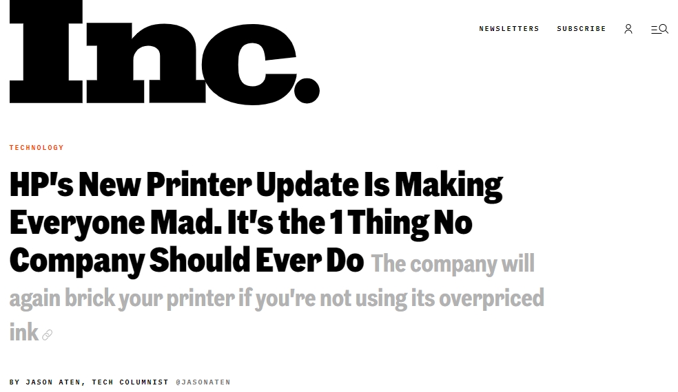 온라인 경제매체 잉크는 “비싼 카트리지를 쓰지 않으면 프린터를 무용지물로 만드는 조치를 HP가 내놨다”면서 “HP의 새 프린터 업데이트 조치로 소비자들의 원성이 하늘을 찌르고 있다”고 보도했다.