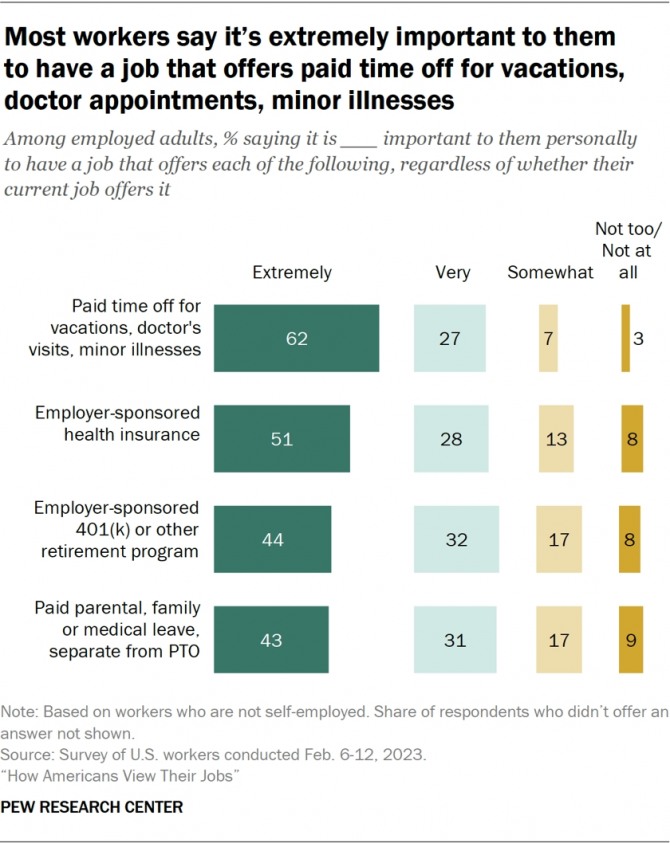 28일(현지시간) 비즈니스인사이더에 따르면 미국 여론조사업체 퓨리서치센터가 미국 직장인 5900명을 대상으로 지난 2월 6~12일 조사한 결과 응답자의 96%가 몸이 안좋아 쉬기 위해 또는 휴가를 위해 유급휴가를 가는 것이 회사에서 건보료를 지원 받는 것보다 중요하다는 의견을 피력했다.
