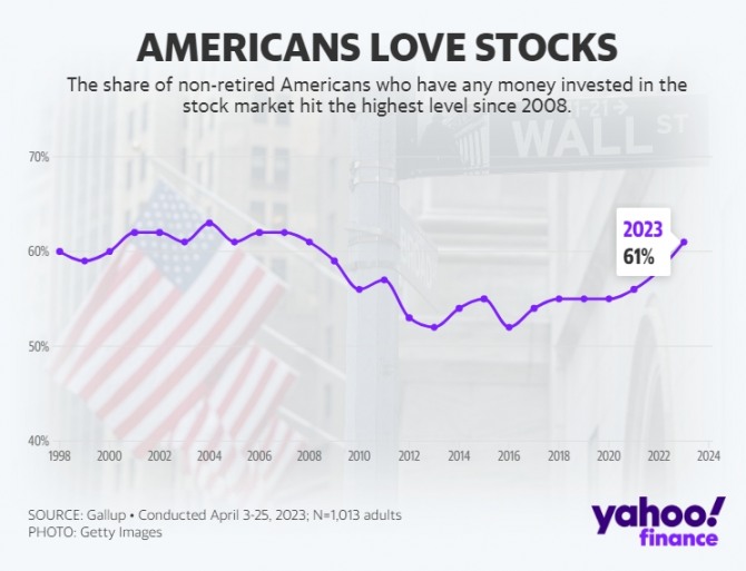 3일(현지시간) 야후파이낸스에 따르면 갤럽의 올해 조사에서 나타난 확인된 결과의 핵심은 2008년 금융위기 이후 미국민의 주식 보유율이 꾸준히 오름세를 보인 끝에 60% 선을 돌파했다는 점이다.