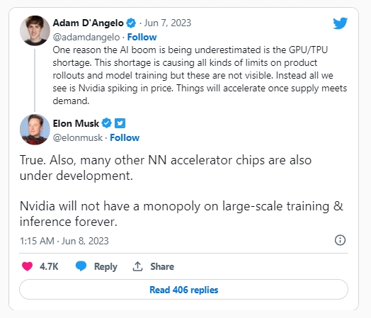 머스크는 앞서 한 트위터 사용자가 “AI 붐이 과소평가되고 이유 가운데 하나는 GPU와 TPU 부족 사태로 AI 관련 제품의 출시와 생성향 AI의 가동을 위한 대규모 언어모델의 훈련에 지장을 주고 있지만 이같은 측면은 드러나지 않는 대신 엔비디아 제품의 가격만 오르는 것을 지켜보는 현상이 벌어지고 있기 때문”이라며 “앞으로 GPU와 TPU 부족 현상이 해소돼 공급이 수요를 충족하게 되면 AI 붐은 가속화될 것”이라고 주장하자 이에 공감한다며 이같이 글을 올렸다.