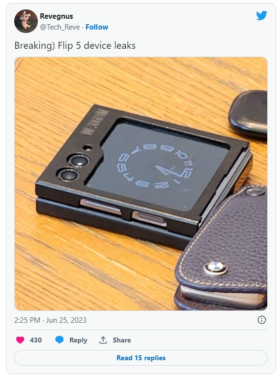 25일(이하 현지시간) 미국의 스마트폰 개발자 포럼 XDA에 따르면 @Tech_Reve라는 이름을 쓰는 트위터 사용자가 삼성전자 갤럭시Z플립5 실물로 보인다는 사진을 전날 트위터에 공개했다.