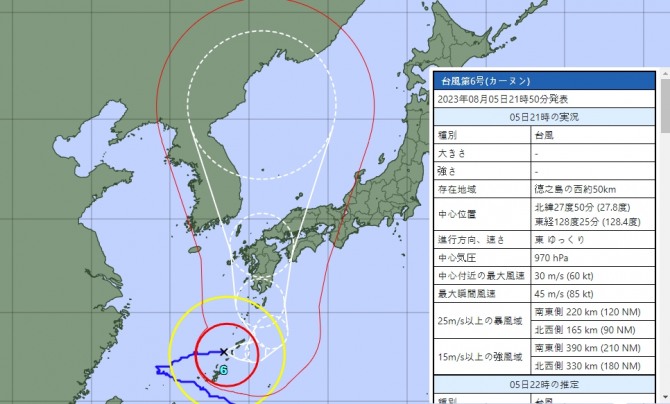 이어 "6일 이후의 진로는 명확하지 않지만, 서서히 규슈와 혼슈 서부에 가까워져 영향을 미칠 가능성이 있다"고 전했다.