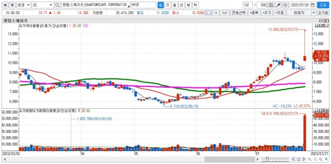 퀀텀스케이프는 1.34달러(14.30%) 폭등한 10.71달러로 장을 마쳤다.