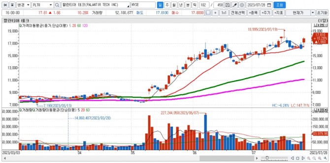 팔란치어는 아이브스 분석노트에 자극받아 1.66달러(10.28%) 폭등한 17.81달러로 올라섰다.