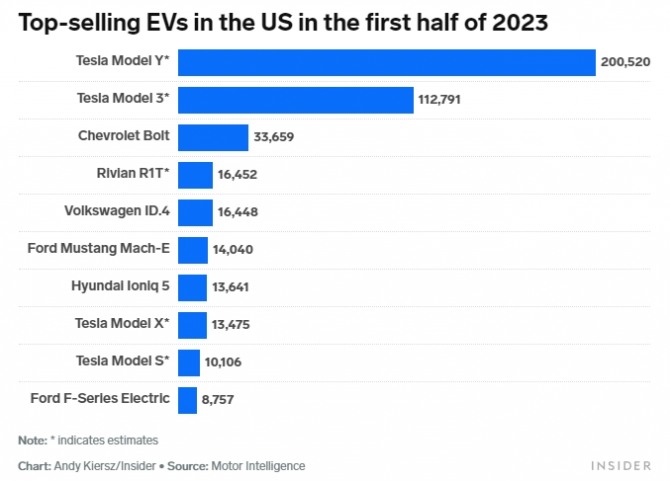 자동차시장 조사업체 모터인텔리전스에 따르면 지난 상반기 동안 미국에서 팔린 전기차 가운데 모델Y의 판매량은 20만520대, 모델3는 11만2791대로 3위를 차지한 GM의 순수전기차(BEV)인 쉐보레 볼트(Bolt) EV를 가볍게 제친 것으로 집계됐다. GM은 플러그인 하이브리드카(PHEV)인 쉐보레 볼트(Volt)도 판매하고 있다.