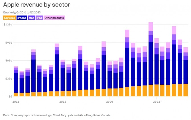6일(이하 현지시간) 악시오스에 따르면 애플은 지난달 1일 마감된 2023 회계연도 3분기 실적을 지난 3일 발표하면서 매출이 전년 동기 대비 1% 감소한 818억 달러를 기록했다고 밝혔다.