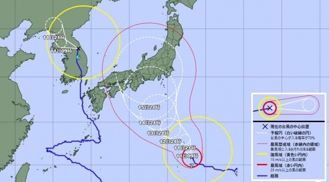 제6호 태풍 '카눈'이 규슈 서쪽을 스치듯 빠져나가자마자 일본은 7호 태풍 '란'의 이동 경로에 긴장하고 있다. 태풍의 중심기압은 975hPa(헥토파스칼)이며, 중심 부근의 최대 풍속은 초속 30m다. 최대 순간 풍속은 초속 45m이며, 중심에서 반경 130㎞ 이내 지역에서는 초속 25m 이상의 강풍이 불고 있다. 당분간 북서진하면서 12일에는 오가사와라 제도에 접근, 폭풍과 높은 파도를 일으킬 것으로 기상청은 예상했다. 이미 오가사와라 제도에는 강한 바람이 불면서 지자체 공무원들이 대피소 설치를 논의 중이며 일부 건물에는 유리창 파손에 대비해 판자를 다는 모습도 보인다고 NHK는 전했다.