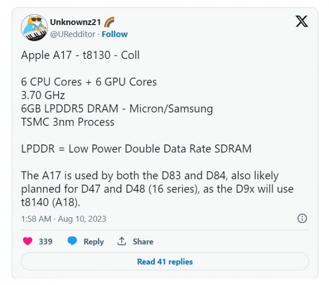 언노운즈21은 해당 게시물에서 A17 칩이 6코어 CPU와 6코어 GPU로 구성되어 있으며, 6GB(기가바이트) 용량의 LPDDR5 메모리를 사용한다고 설명했다. 메모리는 삼성과 마이크론이 공급하며, A17 칩의 제조는 TSMC의 최신 3나노미터(㎚) 공정을 사용한다.