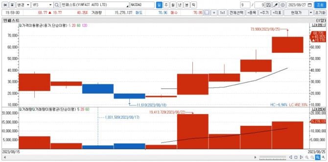 빈패스트는 68달러에 육박하는 주가를 바탕으로 시가총액이 1560억달러 수준으로 폭증했다.