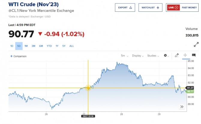 이미지 확대보기30일 뉴욕증시와 뉴욕상업거래소(NYMEX)에 따르면 11월물 미국 서부 텍사스산 원유(WTI)는 전 거래일 대비 0.92달러(1%) 하락한 배럴당 90.79달러에 마감했다. 런던 ICE선물거래소에서 11월물 브렌트유는 0.04달러(0.04%) 내린 배럴당 95.34달러로 집계됐다.
