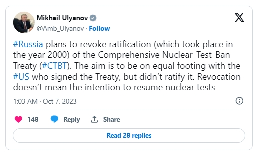 러시아의 CTBTO 비준 철회 방침은 국제원자력기구(IEAE) 본부가 있는 오스트리아 빈 주재 러시아 대표부의 미하일 울리야노프 대사의 입을 통해 발표됐다. 그는 크렘린궁의 지시에 따라 러시아의 대외 핵 협상을 총괄하는 책임자다.
