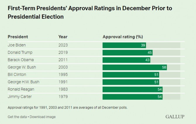 갤럽이 차기 대통령선거를 앞둔 12월 기준으로 역대 초선 대통령의 지지율을 조사한 결과 바이든 대통령 다음으로 저조한 지지를 받은 사례는 버락 오바마 대통령이 지난 2011년 43%를 기록한 경우와 도널드 트럼프 대통령이 지난 2019년 45%를 기록한 경우다.