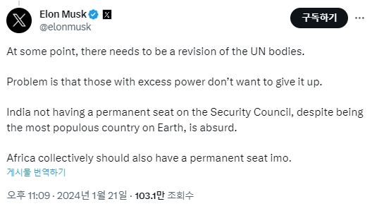 머스크는 안토니우 구테흐스 유엔 사무총장이 앞서 올린 트윗에서 “아프리카 대륙을 대표하는 국가가 유엔 안보리 상임이사국으로 이름을 올리지 못하고 있는 것은 납득하기 어렵다”고 주장한 것에 공감을 표시하며 이같이 주장했다.