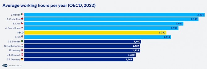 2022년을 기준으로 할 경우 독일 근로자들의 연간 평균 근로시간은 1350시간에 미치지 못한 것으로 조사됐다. 이는 경제협력개발기구(OECD) 회원국 가운데 가장 낮은 수준이다.
