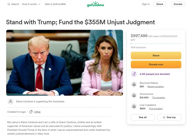 이미지 확대보기뉴스위크에 따르면 트럼프의 개인사업체들이 은행 대출을 받는 과정에서 자산 부풀리기를 해 부당한 이익을 챙겼다는 혐의가 인정돼 미국 뉴욕 법원으로부터 3억달러(약 4000억원)가 넘는 벌금형을 선고받은 것과 관련해 트럼프 지지자들이 미국의 모금 사이트 ‘고펀드미’를 통해 확보한 모금액이 모금 개시 6일 만에 100만달러(약 13억3000만원)에 육박했다.