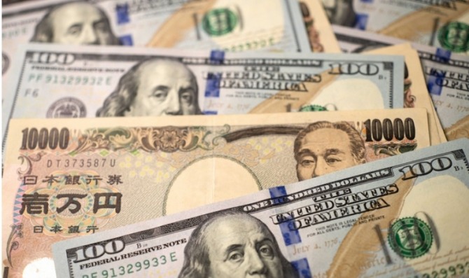 미국 달러화와 일본 엔화 지폐가 번갈아 놓여 있다. 사진=신화/뉴시스
