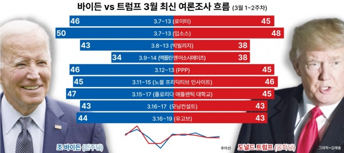 그러나, 3월 민주당과 공화당 후보 확정 이후 트럼프가 우세했던 여론조사 흐름에 변화가 나타났다. 관망하던 민주당 지지층과 일부 중도층이 바이든으로 이동하는 모습이 확인되고 있다.