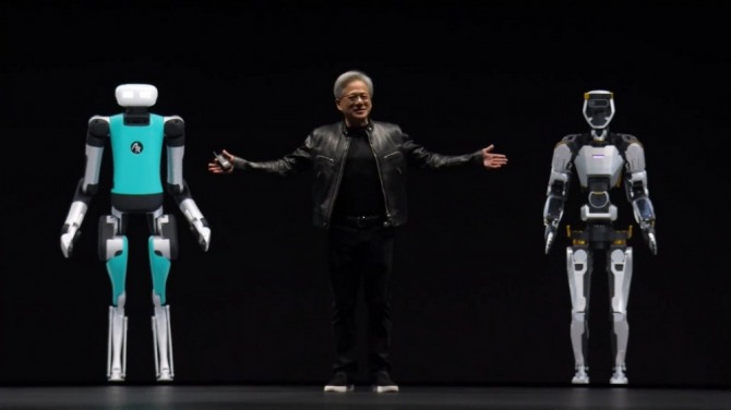 젠슨 황 엔비디아 최고경영자(CEO)가 연례 개발자 콘퍼런스 'GTC 2024' 기조연설에서 자사 AI 기술을 사용한 로봇 제품들을 소개하고 있다. 사진=엔비디아 유튜브 갈무리