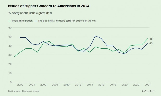 갤럽은 특히 공화당 지지층에서는 불법 이민 문제에 우려하는 응답률이 전년 동기 대비 1% 감소해 큰 변화가 없는 것으로 확인된 반면, 민주당 지지층 사이에서는 14%에서 27%로 크게 늘어나 눈길을 끌었다고 지적했다.