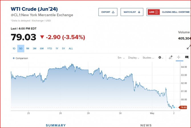 2일 뉴욕증시와 뉴욕상업거래소에 따르면 6월 인도 서부텍사스산 원유(WTI)는 전일대비 2.93달러(3.58%) 급락한 배럴당 79.00달러에 거래를 마감했다. 뉴욕 국제유가는 7주 만에 80달러선을 밑돌았다. 원유 수요 부진 우려와 함께 주간 원유 재고가 증가하고, 이스라엘과 하마스 간의 휴전 협상이 막바지 단계로 진행되면서 유가는 3거래일 연속 하락했다. 지난 3월 12일 이후 최저치다. 하락폭은 지난 1월 8일 이후 최대폭이다.